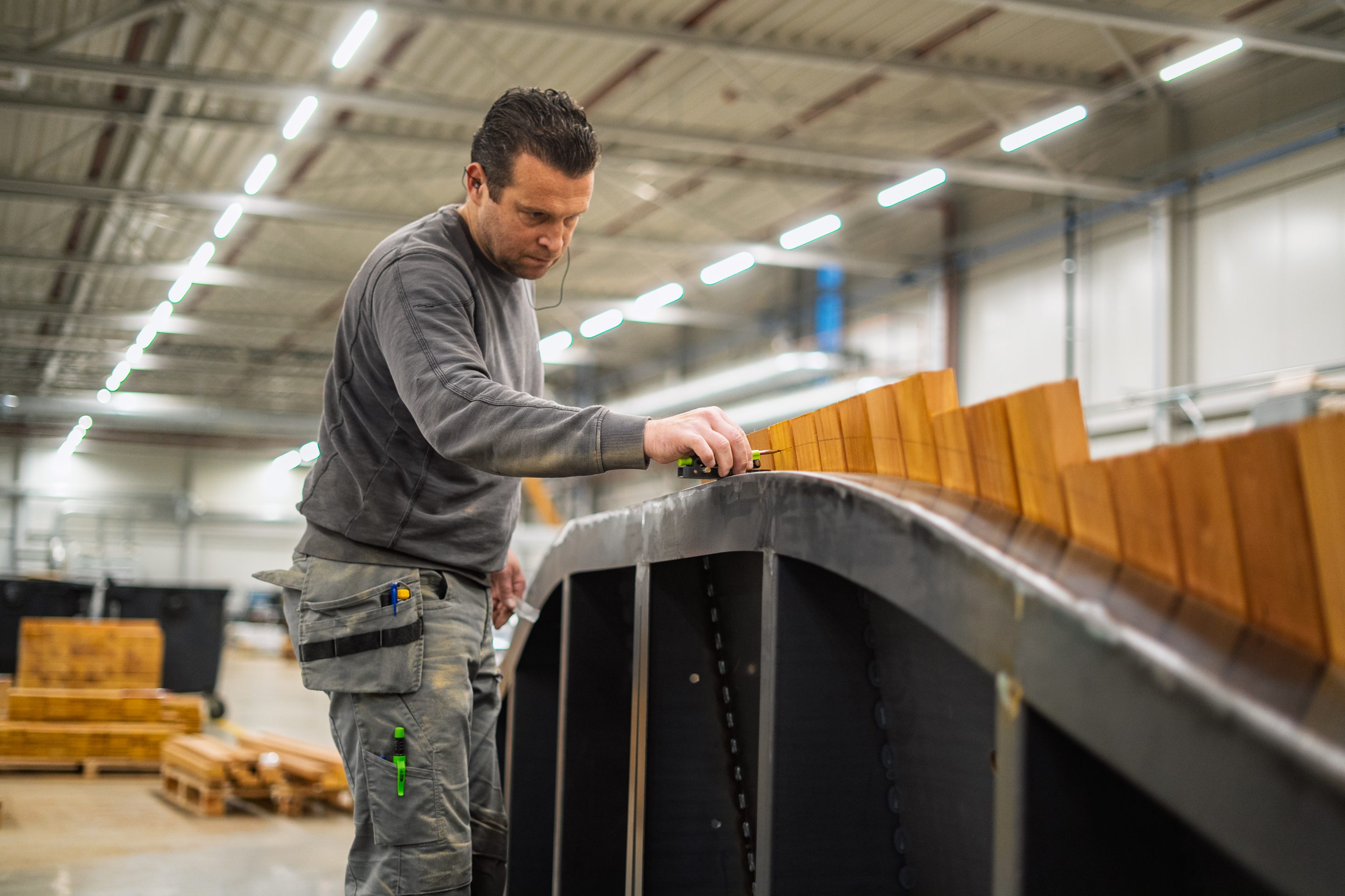 ‘Wij doen alles, van a tot z in eigen beheer’, legt Oscar uit. ‘Van ontwerp tot en met de levering. Neem een daktuin met een bepaalde opzet qua keerwanden. In die keerwanden is een schetsontwerp opgenomen van een bepaalde type bank in een specifieke vorm. Dan werken wij die bank uit, zetten deze om in materialen waarbij wij beoordelen welk materiaal het beste gebruikt kan worden voor het frame en hoe dit qua constructie aan te pakken. Het ontwerp dat daaruit voortkomt, bespreken we met de opdrachtgever, waarna we productietekeningen maken en de bank zelf produceren.’
